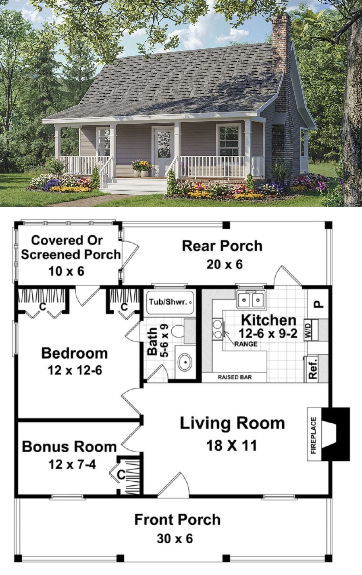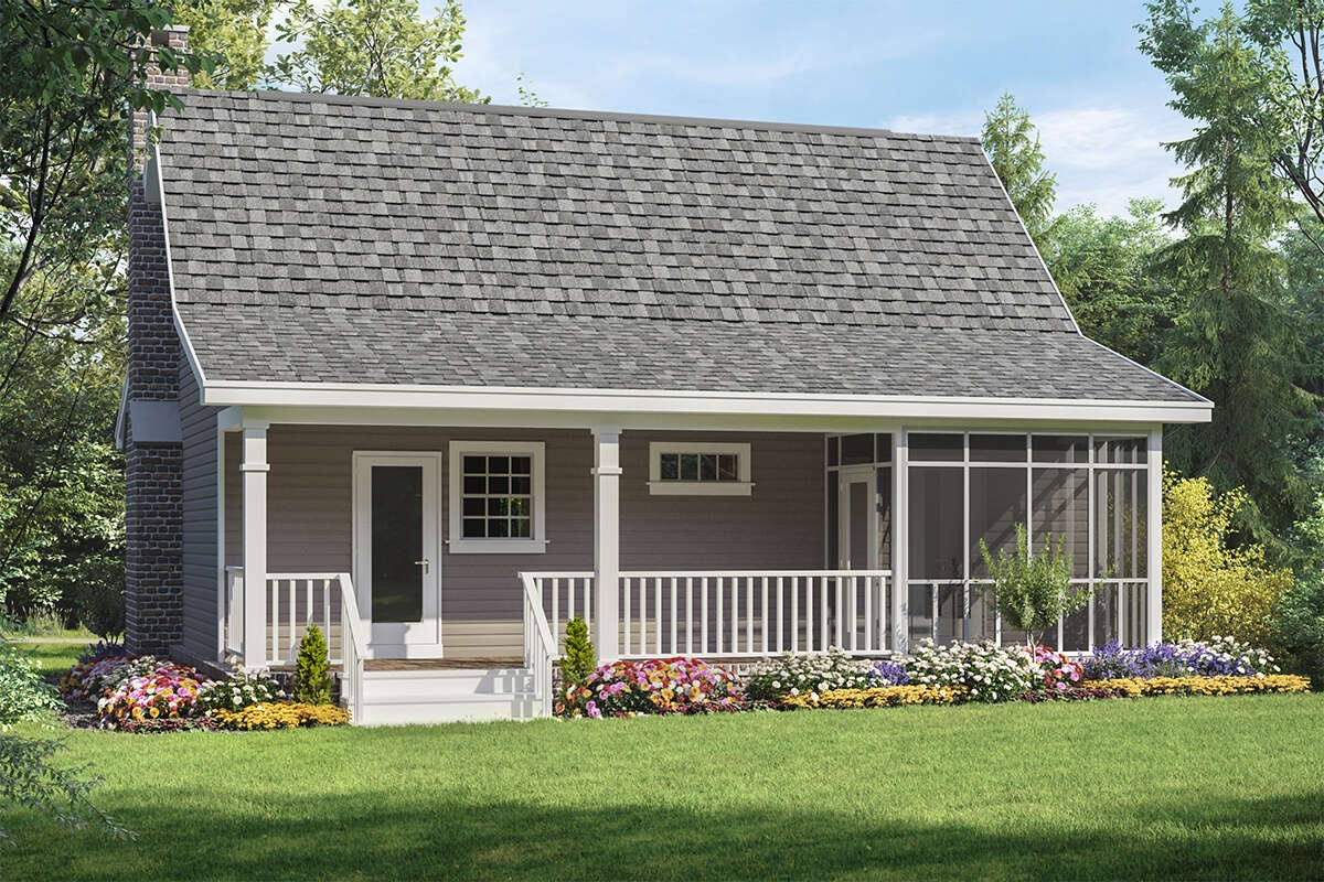 The exterior keeps a timeless cottage look with simple gables, clean trim, and a sheltered front porch. Large windows bring in natural light, and the compact footprint keeps construction straightforward and budget friendly.