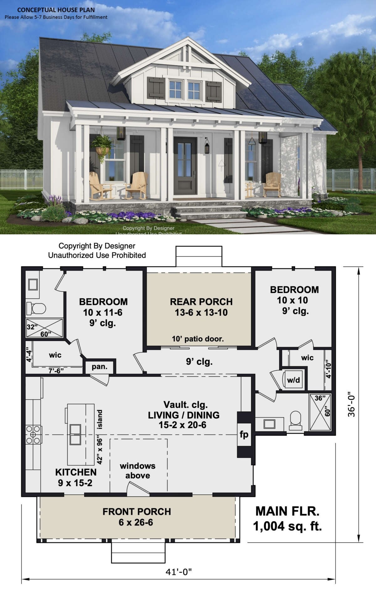 This 1,004-sq-ft modern farmhouse is proof that smart design can deliver full comfort and timeless style at modest scale. With two bedrooms, two baths, and generous porches, it’s a plan built for cozy living without compromise.