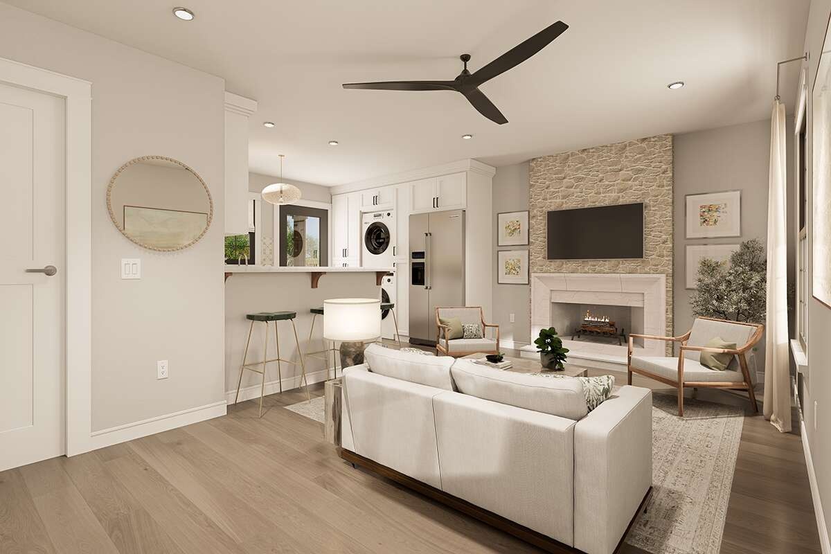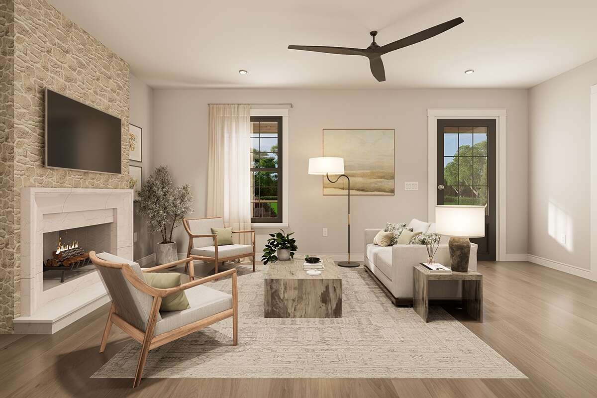 The living area centers on a comfortable seating zone sized for a sofa and two chairs, with a natural focal wall for media or a compact electric fireplace.