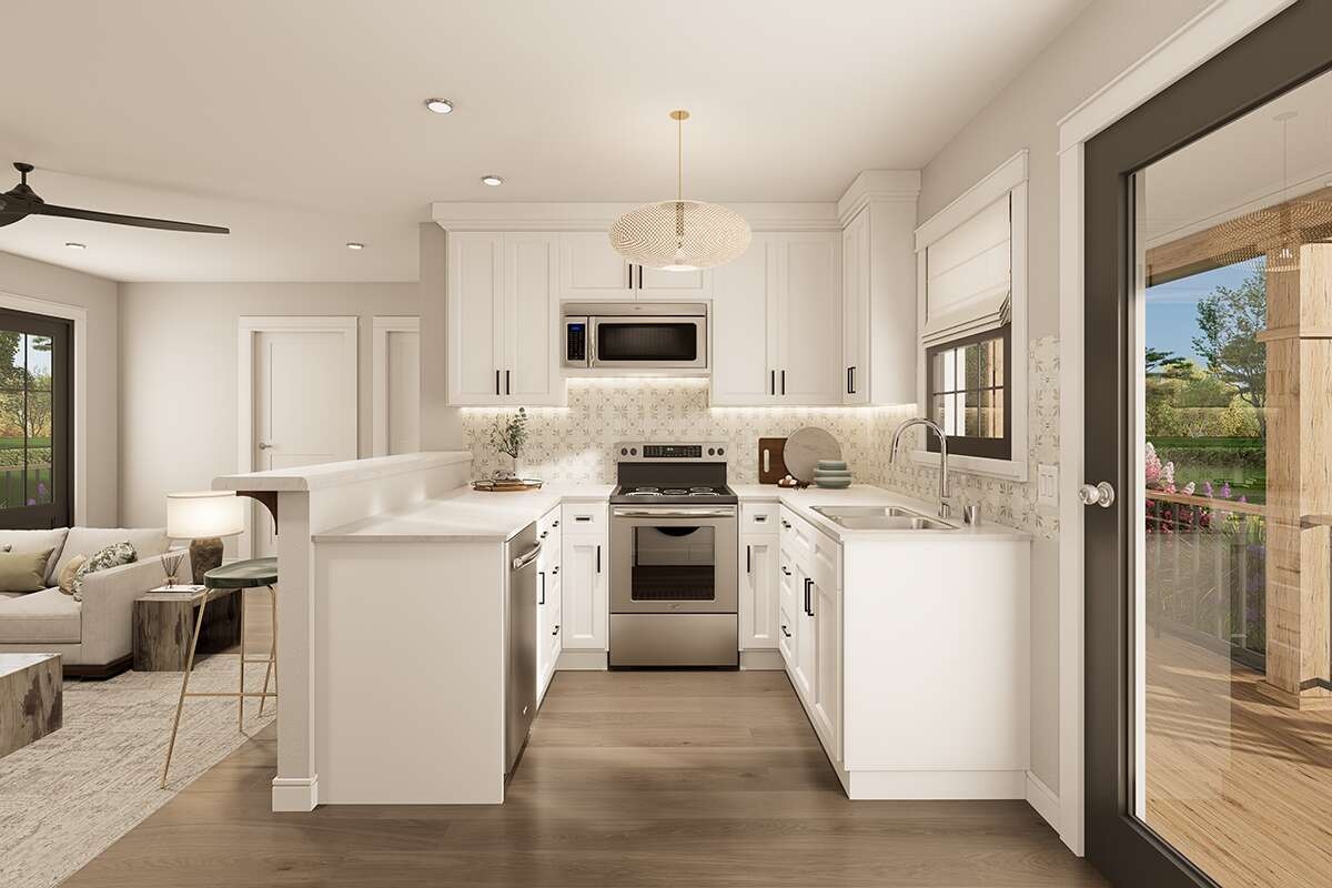 The kitchen is practical and efficient. A straight run or L-shaped counter supports prep, cooking, and cleanup in one zone. A compact island or rolling cart can add work surface when you need it and slide out of the way when you don’t.