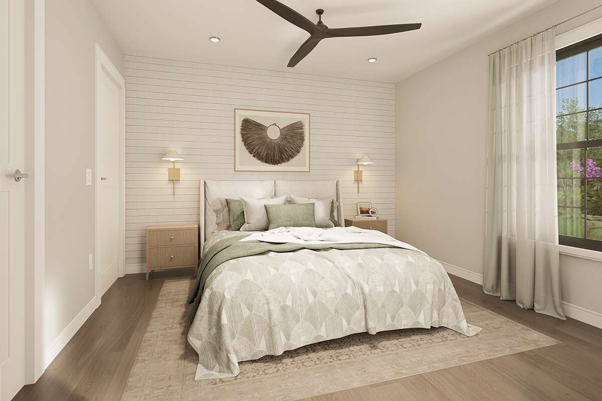The bedroom is calm and proportioned for a queen bed, nightstands, and a dresser or small desk.