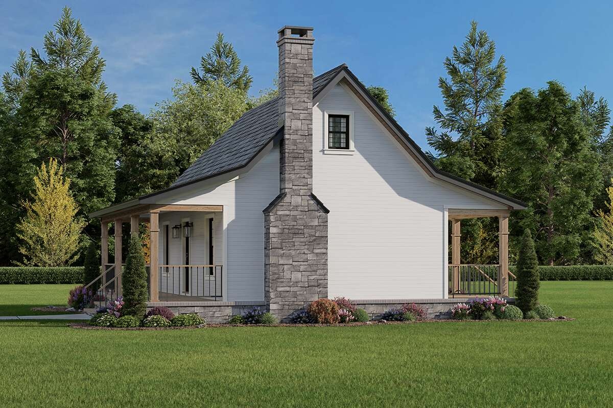 The covered front porch is an outdoor room in disguise. Two chairs and a small bistro table turn it into your morning coffee spot or an evening wind-down perch. If your site allows, a small rear stoop or patio can extend living outdoors even further for grilling and container gardening.